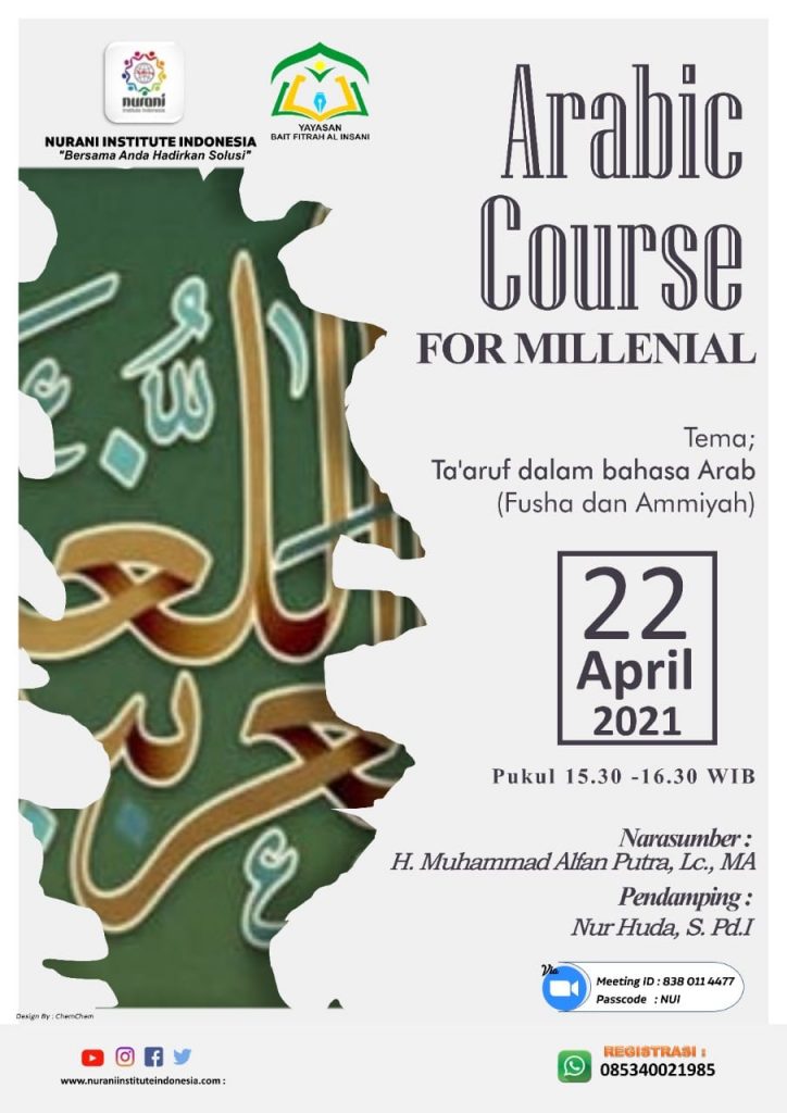 ProgramARABIC COURSE For Milenial April 21, 2021September 18, 2021 - by NUI - Leave a Comment Berbagi Mari Ikuti ARABIC COURSE For Milenial HARI INI :insya Allah, Ilmu Bertambah, Pahala MelimpahTopic: *Kajian Tematik Ramadhan 1442 H* Arabic Course :Time: 22 Apr , 2021 15.30 WIB.*Join Zoom Meeting*http://bit.ly/KajianTematikRamadhan1442H*Meeting ID:* 838 011 4477*Passcode* : NUI